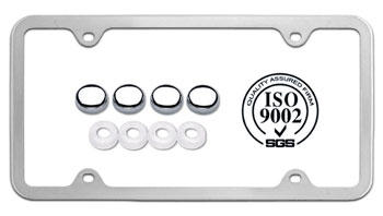 Each license plate frame marketed by Licenseplates.tv is minted from the best available stainless-steel and hand polished before being finished in glittering chrome or Onyx-gloss Black. Engineering standards are designed to meet or exceed the criteria established by ISO and Licenseplates.tv will not offer any license plate frame on its website which does not up to ISO-9002 standards. Each license plate frame marketed under the AutoMark brand name by Licenseplates.tv was designed to fit 6” x 12” standard license plates perfectly and to add elegance to your car. To add uniformity, Licenseplates.tv also includes chrome or black screw cap covers so screw heads will be hidden. Aircraft grade stainless steel is not heavy, but strong with zero chance of corrosion or rusting –even in areas close to the ocean or where roads are salted during winter.