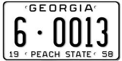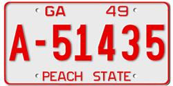 The first Georgia license plates were issued by the cities of Atlanta and Savannah in 1904. The few license plates which have survived are just a serial number with no other markings. The state of Georgia first required license plates in 1910. The first and only slogan used on Georgia license plates is “PEACH STATE”, starting in 1940 and 1941 but continuing between 1947 and 1980. The rarest Georgia license plate is most likely the 1941 issue where an embossed area was created to place a decal of a peach. This graphic was placed in the center of the license plate separating the license plate number. It was not until 1990 when Georgia issued a license plate with a peach. This time the peach was screened on to the retro reflective film which covers an aluminum substrate.