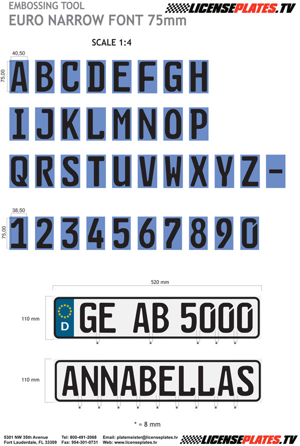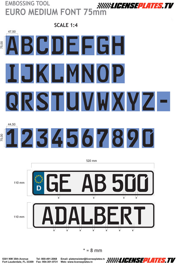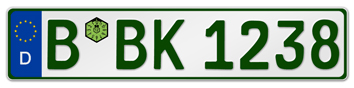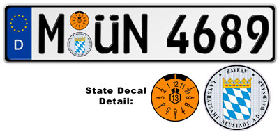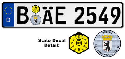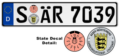 German License Plates German license plates are the most popular license plates in the world because of the famous heritage of German car brands like Audi, BMW, Mercedes-Benz, Porsche and Volkswagen.     The unique shape of German car license plates measure  4.38 inches high x 20.44 inches wide (110 mm high x 520 mm wide) and motorcycle license together with its unique embossed fonts ensures easy recognition.  German motorcycle license plate dimensions are 5.25 inches high x 9.5 inches wide. Metric Dimensions are 130mm high x 240mm wide. Typeface Modern German plates use a typeface called FE-Schrift (“fälschungserschwerende Schrift”, tamper-hindering script). It is designed so that the O cannot be painted to look like a Q, and vice versa; nor can the P be painted to resemble an R, among other changes. This typeface can also more easily be read by optical character recognition software for automatic number plate recognition than the old DIN 1451 script custom german license plates german license plates custom license plates German License Plate Prefix Letters The prefix letters on German license plates identifies the state/city in which a vehicle is registered.  Germans are required to change their license plates whenever they change their main residence. All german license plates begin with the state/city prefix  -this enables immediate identification regarding the origin of vehicles.   The current German number plate format has been in use since 1994. German license plates maintain the design protocol same as countries within the European Union blue strip on the left shows a country code in white text (D for Deutschland = Germany) and the Flag of Europe (12 golden stars forming a circle on a blue background). The rest of the license plate uses black print on a retro-reflective white background. Right of  the country code Euro strip is a one, two or three letter abbreviation, which represents the city or state where the car was registered, such as B for Berlin, HH for Hamburg, M for Munich and S for Stuttgart.  In some cases an urban district and the surrounding non-urban district share the same letter code. Where this happens, the number of the following letters and digits is usually different.  The number of letters in the city/region prefix code mostly reflects the size of the district. The basic idea was to even out the number of digits on all license plates, because the largest districts would have more digits after the prefix for more cars. The largest German cities generally only have one letter codes (B=Berlin, M=Munich, K=Cologne (Köln), F=Frankfurt, L=Leipzig, S=Stuttgart), most other districts in Germany have two or three letter codes. berlin license plates BERLIN LICENSE PLATE WITH EMISSION DECAL munich license plates MUNICH LICENSE PLATE WITH SAFETY TEST SEAL  stuttgart STUTTGART LICENSE PLATE WITH SAFETY TEST SEAL   List of German License Plate Prefixes and corresponding states/cities