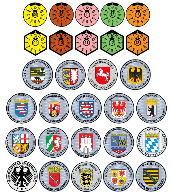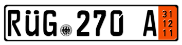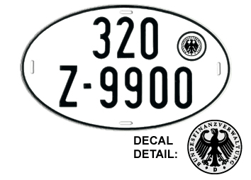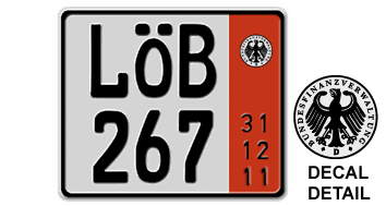 German Export license plates "german license plates" "custom german license plates" "buy german license plate" These German license plates are also known as Ausfuhrkennzeichen or Zoll in English Customs plates and are used for exporting vehicles abroad. The plates are the only ones which do not have the blue Euro strip on the left and the owner does not have to be a German resident to register the car. The date on the red strip on the right hand side does not show the expiration date of the plate; instead it shows the expiration date of the vehicle insurance. After this date the vehicle can no longer drive on German roads. Classic Oval Zoll /Customs License Plate used between 1948 and 1988. german license plates German Military License Plate  Bundeswehr The German military use the old style non-reflecting plates with a dash between the two circles. The German flag is shown, instead of the blue EU strip. Military plates use the letter Y, rather than a city indicator (no German city name starts with a Y). After the Y comes a six-digit number (or five digits for motorcycles), for example Y-123456. These vehicles are tax-exempt and need not to be insured since the German government acts as insurer. There is also no mandatory technical inspection required but the Armed Forces carry out a regular internal inspection on these vehicles similar to the official inspection. Some branches of the Federal Government and Federal State governments use the abbreviations of their names instead of a city code. Example: the Technisches Hilfswerk (German Federal Agency for Technical Relief) uses its abbreviation THW, so the plates read THW-80000, for example. All numbers on THW plates start either with the digit 8 or 9. Before the Deutsche Bundesbahn (German National Railways) and the Deutsche Bundespost (Federal Post Office) were privatised, they used the abbreviations DB and BP (e.g. DB-12345, BP-12345). The Wasser- und Schifffahrtsverwaltung des Bundes (Federal Water and Ship Transport Authority) uses BW followed by a digit identifying the region of the office (from 1=north to 7=south). "german license plate" German Federal Police License Plates     Bundespolizei (Federal Police), code in use since 2005. The federal police uses the code BP instead of the local code. Before 2006 they used the code BG (former name: Bundesgrenzschutz) (BG-#####), this old code remains still valid, only new vehicles will get the new “BP”-code. German License Plate Decals/Seals "license plates german" Emission test (front plate) was applied up to 2010 and vehicle safety test (rear plate) seals are also attached to the plate. The expiration date can be figured out as follows: The year is in the centre of the seal and the seals are attached with the month of expiration pointing upwards. The black marking on the side (near the 12) thus makes it easy for the police to see the expiration month from a distance. Like a clock, the marking shows the same position of a number on the face of a clock. For example the black marking is on the left side, so it is the ninth month (or 9 o’clock) and hence the expiry date is 30 September. The colors are repeated every 6 years. Emission test stickers are no longer used for tests done since beginning of 2010: The safety test sticker covers both. The lower decal is the official seal of registration. It always carries the seal of the respective German Bundesland, with the place or district of issue being added in print. Some seals carry the German Bundesadler instead of a Bundesland’s seal, e.g. number plates used on Bundespolizei vehicles. Colors of the emission test (before 2010) and vehicle safety test seals: Purchasing German license plates on the internet can be tricky.  Over the past few years many online retailers have added German license plates to their product line.  Customers are not too sure if they can customize their German license plate of if the online retailer is selling random numbers on plates.  In most cases, customers pay more for customizing their plates.  If German state seals are added, extra charges are added.  Shipping, charges can top $15.00.  Licenseplates.tv has the fastest delivery service, consistently good quality, free German state decals  and pollution seals. license plates in german