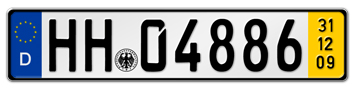 • Vehicles which have not been registered (because they are for transfer within Germany) have to carry short-term plates valid only for five days. The code starts with the numbers 04, e.g. DD-04000, and the plate has a yellow strip on the right showing when they are valid. The date is listed numerically, on three lines, reading day, month, year, with two digits each. The vehicle need not have a valid technical inspection, however it must be technically fit to be operated in public. Insurance premiums are quite high, appr. 100 for the above mentioned 5 days. Most insurance companies credit this premium if the car is registered as a normal car with the same insurance company after these 5 days.